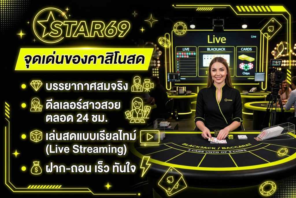 หนึ่งในบริการสำคัญของ star69 คือ คาสิโนสด (Live Casino) ซึ่งเป็นรูปแบบเกมที่เชื่อมต่อผู้เล่นกับดีลเลอร์จริงผ่านระบบถ่ายทอดสด ทำให้บรรยากาศใกล้เคียงกับการเล่นในคาสิโนจริงมากขึ้น ผู้เล่นสามารถรับชมภาพแบบเรียลไทม์ พร้อมวางเดิมพันได้ทันทีจากหน้าจอของตนเอง